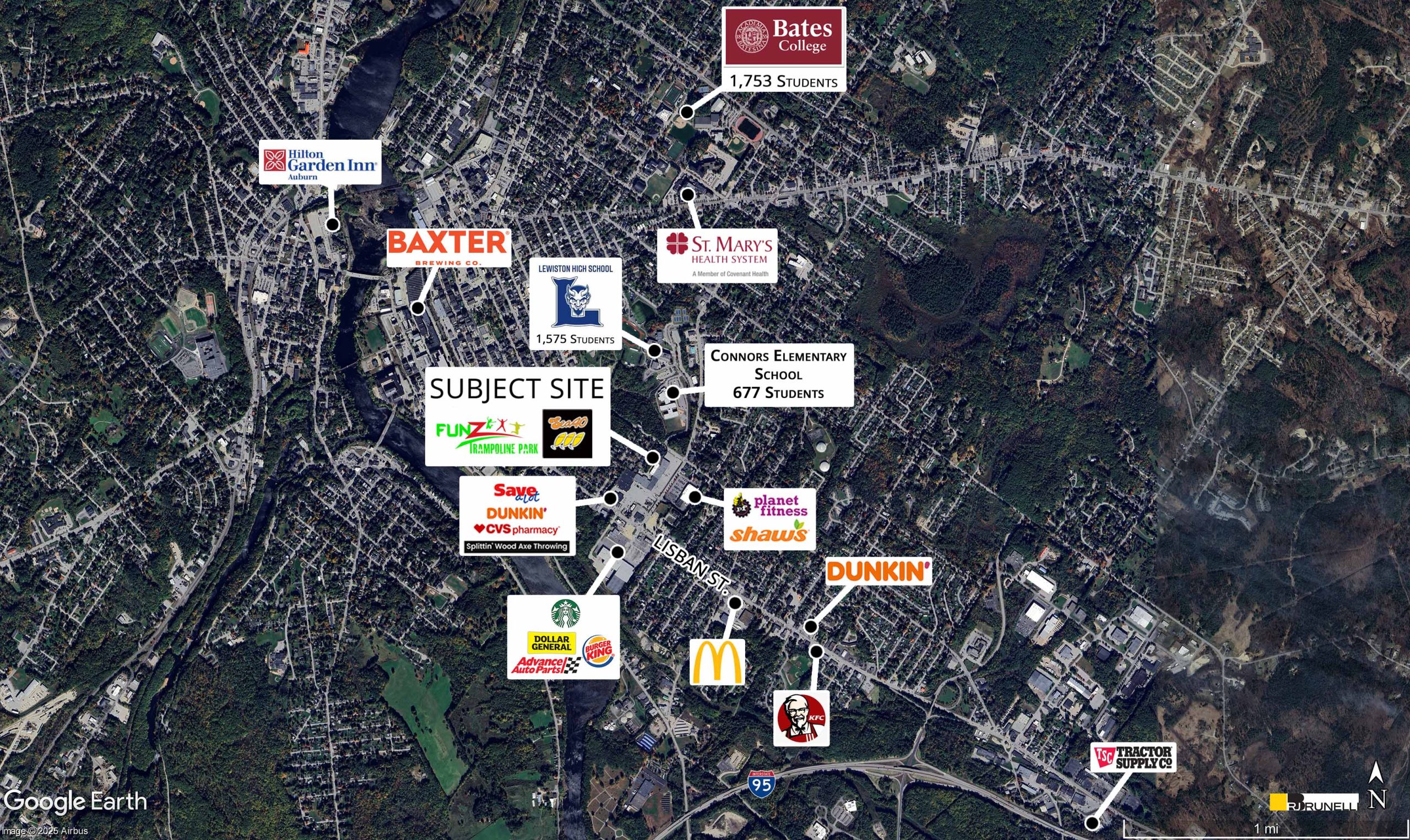 The center is just a 5-minute drive from Bates College, with 1,800 students and multiple nearby student housing complexes and apartments, and only 2 miles from the University of Southern Maine. Additionally, Lewiston High School, located right near the center, has 1,575 students. This location offers a prime opportunity for businesses looking to capitalize on the strong student population.