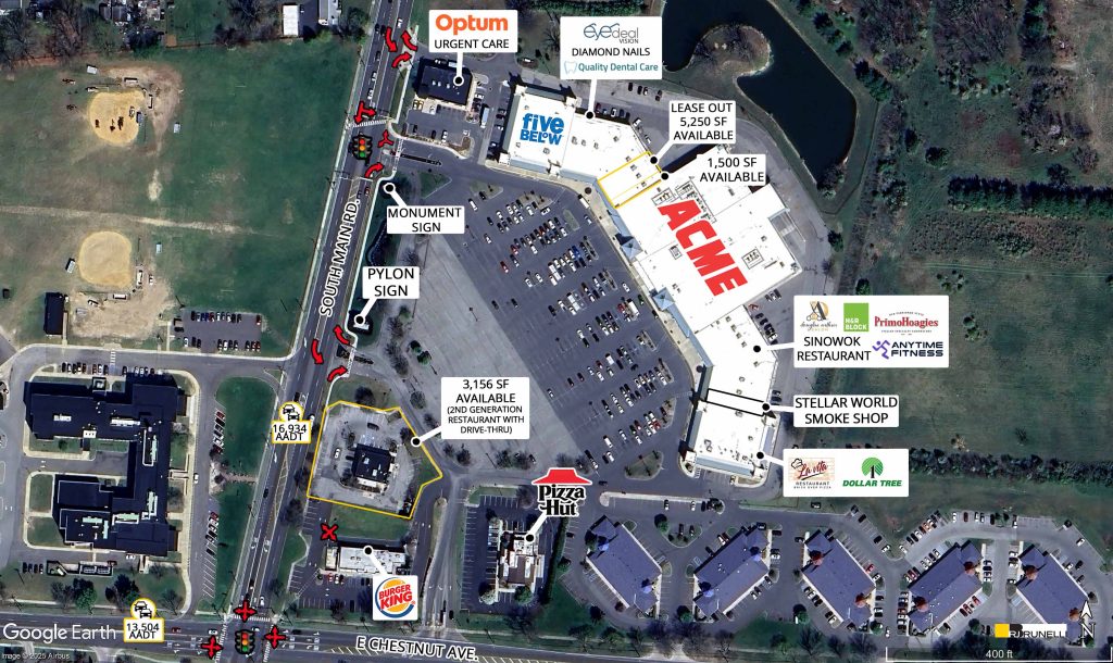 Prime corner location on South Main Rd and E. Chestnut Ave with a total car count of 30,400 cars per day.
