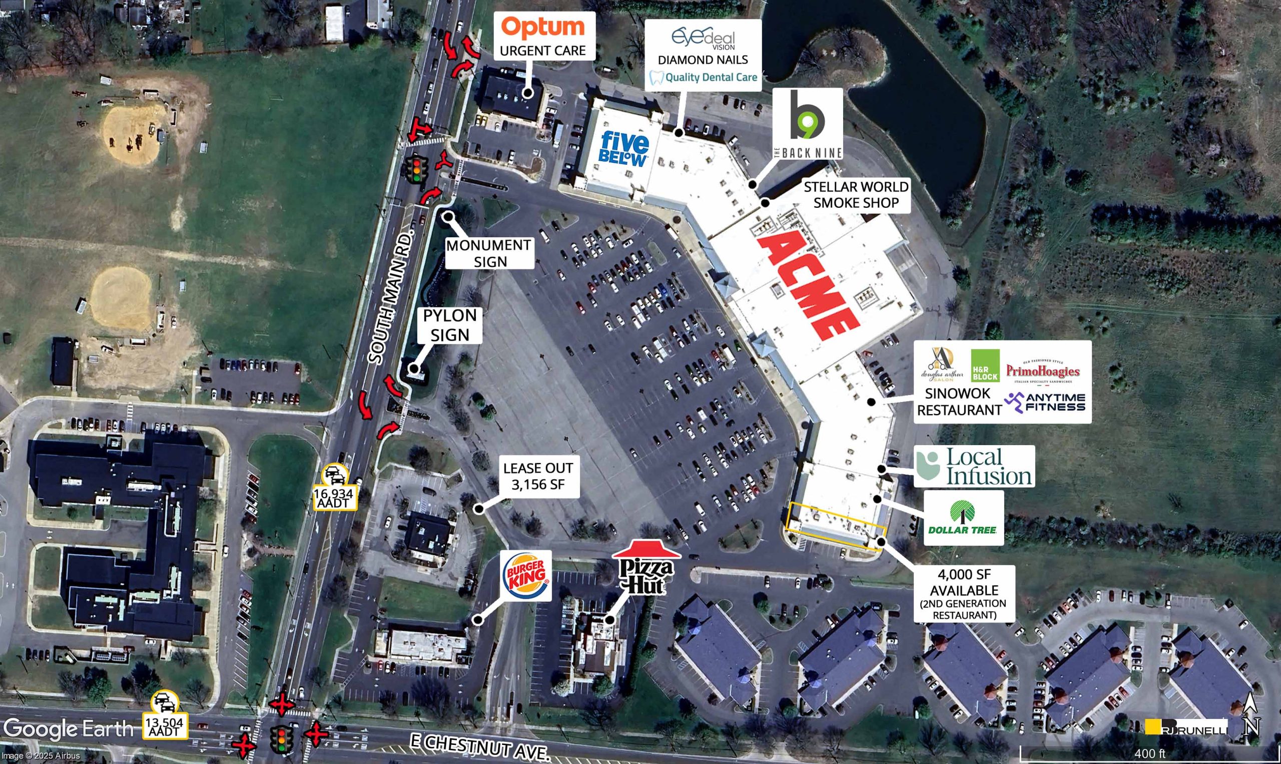 Prime corner location on South Main Rd and E. Chestnut Ave with a total car count of 30,400 cars per day.